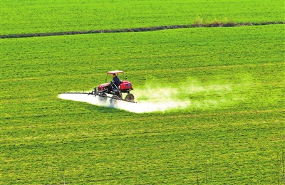 2月18日,正阳县清源街道李通村黄磊家庭农场工人正在对麦田喷施药物。高万宝 摄