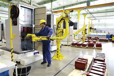 平高电气所属企业通用电气员工正在操作机器人装配开关柜产品。张文 摄