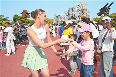 5月3日 ,在周口野生动物世界机械游乐区处,游客们与巡游演员进行愉快互动。 薛兴举 摄