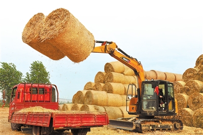 6月2日,农机手驾驶秸秆打包机在夏邑县中峰乡朱双楼村农田里回收秸秆。 夏天 摄