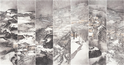 《塬上春雪》材质:瓷板画、水墨、矿物色。贾发军 贾舒程 河南