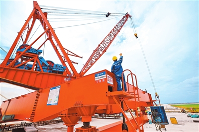 8月1日,安罗高速黄河特大桥施工现场,工人正在忙碌。安罗高速黄河特大桥长15.223公里,是黄河上最长、内陆地区钢结构用量最大的公路桥梁,也是河南省主跨最大、塔高最高、桥宽最宽的黄河公路桥。项目建成后,将极大促进郑州、新乡等沿黄城市群互联互通,对推进黄河流域生态保护和高质量发展具有重要意义。本报记者 邓放 摄