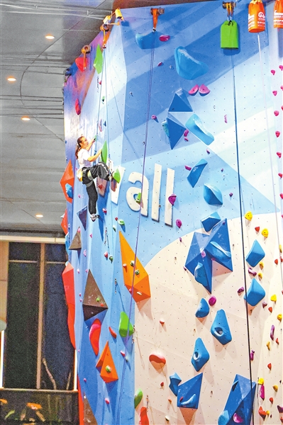 8月9日,郑州绿地双子塔攀岩运动中心,市民在体验攀岩运动。随着攀岩成为奥运会的竞赛项目,越来越多的市民加入攀岩运动,体验运动带来的乐趣。本报记者 聂冬晗 摄