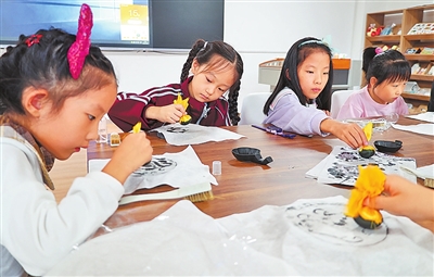 近日,小学生们在洛阳二里头夏都遗址博物馆夏博学堂开展 “古韵拓印”活动。 冯广纳 摄