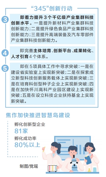 何为“345”创新行动?“3”即着力提升新材料、绿色食品、高端装备及汽车零部件等3个千亿级产业集群科技创新水平;“4”即完善主体培育、创新平台、成果转化、人才引育4个体系;“5”即以小切口实现大突破,在省实验室建设、新型科技创新服务载体建设、科创型种子企业培育等5项工作中力求取得突破。