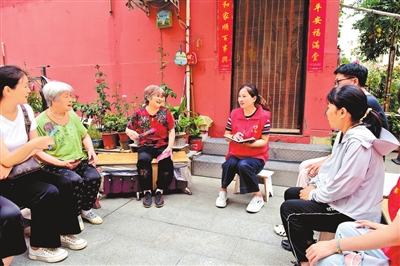卫滨区姜南社区干部“拎凳”办公听群众心声。代娟 摄