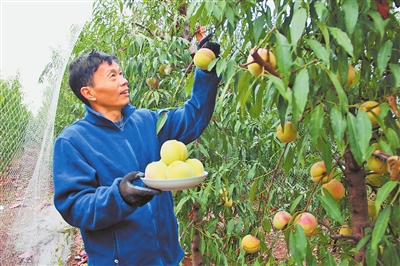 10月21日,位于平顶山市卫东区蒲城街道门楼张村的中威果苗良种示范园内,果农正忙着采摘冬桃。近年来,当地大力发展果木苗圃产业,引领农民靠林果种植增收致富。古国凡 何洋 摄