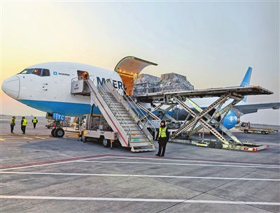1月3日,丹麦马士基航空的全货机在郑州机场装载货物。 阴乐 摄
