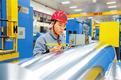 在工作人员的引导下,记者来到铝箔生产现场,只见机械臂灵动挥舞,一排排高大的机器设备正在全力运转,闪烁着银光的铝箔在滚轴上飞速穿梭,依次经过压延、分切、精切等精密工序,最终变成了一卷卷质量优良、光泽度极佳的铝箔产品。