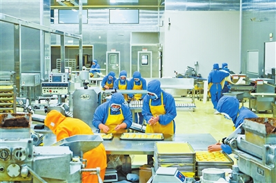 南阳标点食品有限公司生产车间内,工人正在加紧生产速冻面点。张峰 摄
