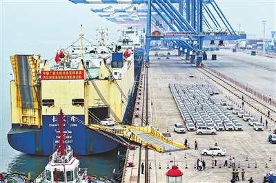 4月7日,在广西钦州港码头泊位,一艘滚装船在进行装船作业。这艘搭载着汽车的滚装船从广西钦州港出发,驶向中东贸易枢纽迪拜杰贝阿里港,这些汽车使用的玻璃均来自西部地区的玻璃生产企业。新华社发