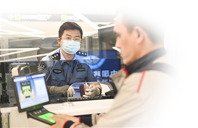 4月19日,乌鲁木齐出入境边防检查站民警为旅客办理入境手续。新华社记者 胡虎虎 摄