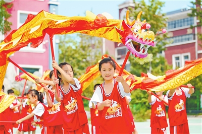 5月29日,睢县古襄路幼儿园的小朋友们在体验舞龙,感受传统文化,迎接“六一”国际儿童节和端午节的到来。 徐泽源 摄