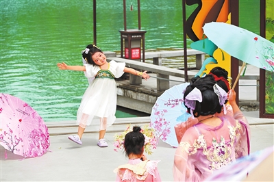 6月1日,在开封市的中国翰园碑林内,家长给表演舞蹈的小朋友拍摄视频。当日是“六一”国际儿童节,许多家长带着孩子来景区游玩,尽享快乐时光。 李俊生 摄