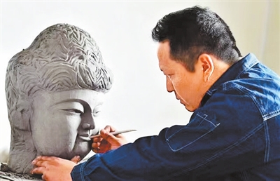 董强峰在工作室制作佛像雕塑。受访者供图