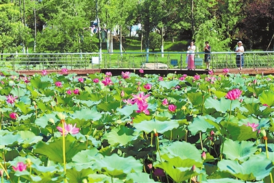 7月3日,南阳市区泮池公园荷塘,游人在拍照。盛夏时节,南阳市各地的荷花迎来盛花期,游客纷纷前往荷塘,欣赏夏日美景。 高嵩 摄