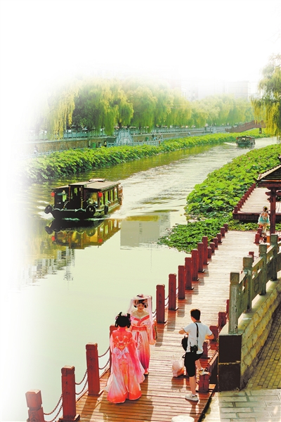 盛夏时节,游客在许昌护城河边打卡拍照。护城河碧波荡漾,游船穿梭,景色宜人,吸引众多市民游客乘船赏荷,打卡拍照。 吕超峰 摄