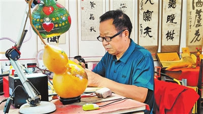 大召营村本土艺术家以烙铁代笔在葫芦上作画。