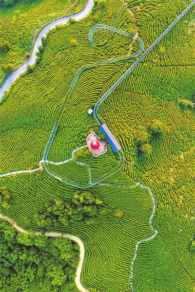 近年来,信阳固始县西九华山景区以万亩茶园作为发展基底,推出了茶山滑道、采茶制茶研学、茶艺文化体验等项目,吸引游客沉浸式领略茶旅一体化的生态魅力。图为7月14日拍摄的茶山与滑道。聂品 摄