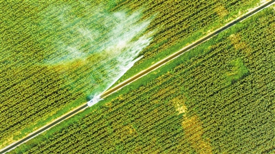 7月16日,在睢县城关镇袁庄村农业科技示范田内,无人智能灌溉机器人正在进行水肥一体化喷灌作业。徐泽源 摄