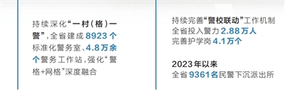 近年来,全省公安机关重心下移、警力下沉,派出所警力占县级公安机关总警力的45.13%,社区民警占派出所总警力的46.66%。基层警力不断充实,装备保障也悄然焕新:出警有电动自行车代步;单警装备渐成标配;人手一部警务通,可将排查出的纠纷、隐患一键上报。社区警务持续提质增效。