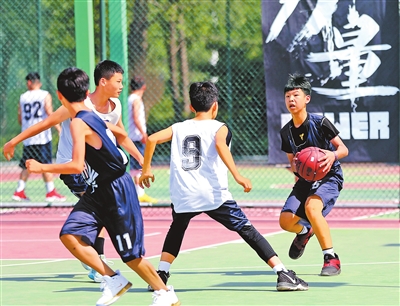 暑假期间,一群学生在郑东新区篮球公园打比赛。