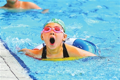 一小朋友在河南省体育中心游泳馆游泳。