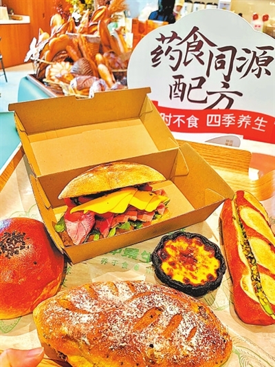 仔细翻看产品标签,每一款都至少包含了一种中药材:山药南瓜奶豆、陈皮蜂蜜蛋糕、鸡内金焦馍、百合杏仁饼干等。茶饮类产品也很“养生”:柠檬茶里放有藿香、紫苏,酸梅梨汤搭配山楂、薄荷、甘草,宣传页上写着“本草茶咖”。