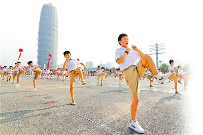 郑州某学校组织学生在如意湖广场表演健身操。本版图片除受访者供图外均为本报记者 邓放 摄