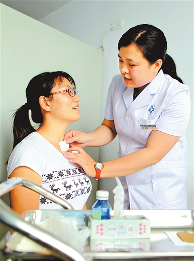 7月31日,在河南中医药大学第三附属医院,46岁的黄女士正在接受穴位埋线治疗。