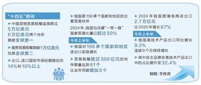 开放带来进步,合作才能共赢。我国是150多个国家和地区的主要贸易伙伴,2024年,我国与共建“一带一路”国家贸易比重已超过50%。今年上半年,我国对190多个国家和地区进出口实现增长,贸易规模超过500亿元的伙伴数量达到61个,比去年同期增加5个。