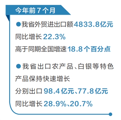 进出口产品方面,我省出口农产品、白银等特色产品保持快速增长,分别出口98.4亿元、77.8亿元,增长28.9%、20.7%。进口产品来看,部分重要原材料和农产品进口增速较快。前7个月,我省进口机电产品877.1亿元,增长10.2%。进口农产品95.3亿元,增长28.4%。进口未锻轧铜及铜材57.6亿元,增长81%。