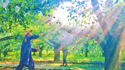 8月15日,果农在柘城县牛城乡王楼村梨园忙碌。该村发展梨果种植200多亩,是远近闻名的梨果种植专业村。张子斌 摄