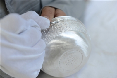 万洋集团白银制品生产车间,工人正在为产品图案压光。