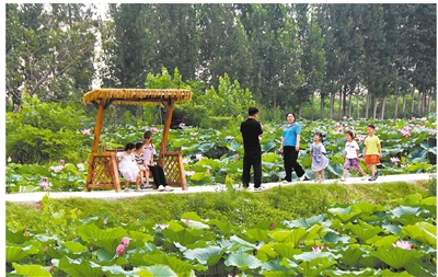 8月24日,游客在平顶山市湛河区曹镇乡曹北村百亩荷塘景区游玩。近年来,在和美乡村建设中,该区通过整体提升生态环境和景观风貌,实现宜居与宜游深度融合,激活全域旅游发展新动能。