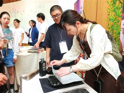 开封木版年画非遗技艺展台前,游客亲手制作木版年画。