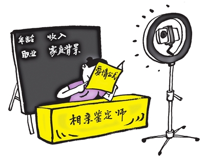 据《中国青年报》报道,近期,一些社交平台上出现标注“相亲鉴定师”的直播间,在直播间内,主播以“婚恋军师”自居,根据适龄男女的物质条件,来量化评估其在婚恋市场上的竞争力。有评论认为,直播间里的“爱情公式”,难以算出真正的幸福。 图/王怀申