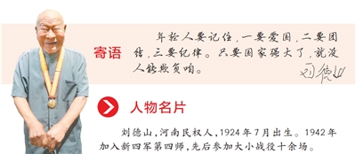刘德山曾作为抗战支前模范代表,到天安门广场参加纪念抗战胜利70周年阅兵。10年过去了,老人对那次经历记忆犹新:“方阵车队在观礼台前缓缓行进,那一刻,我全身的力气仿佛都要迸发出来,就想让全世界看到抗战老兵的精气神儿。”