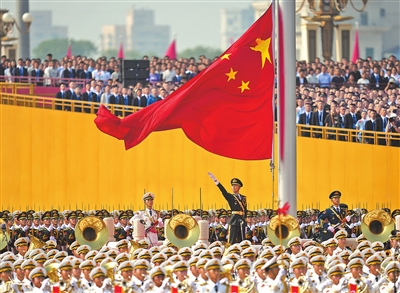 9月3日,纪念中国人民抗日战争暨世界反法西斯战争胜利80周年大会在北京隆重举行。这是天安门广场举行隆重的升国旗仪式。 新华社记者 陈晔华 摄