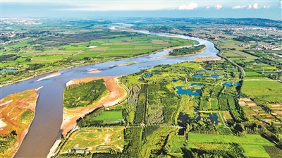 9月13日,俯瞰位于洛阳市孟津区白鹤镇的万羽洲黄河湿地,风景如画。 郑占波 马绍磊 摄