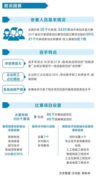 9月19日晚,第三届全国技能大赛开幕式在郑州航空港区举行。本届大赛,比赛项目涵盖30多个行业,智能制造、数字技术、新能源等赛项占比超过50%;国赛精选项目参赛选手中,一线职工占半壁江山;世赛选拔项目中,00后成主力……这是技艺的切磋、才华的展示,是一个民族匠心传承与时代创新的交响,更是观察中国力量、中国梦想的一扇窗口。