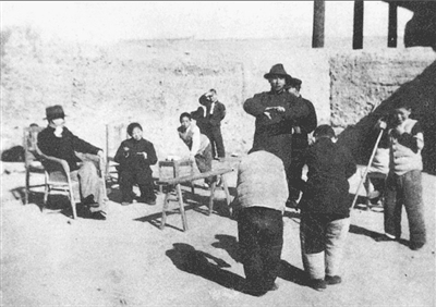 樊粹庭(坐藤椅者)、韩盛岫(中立者)在为学员排戏。