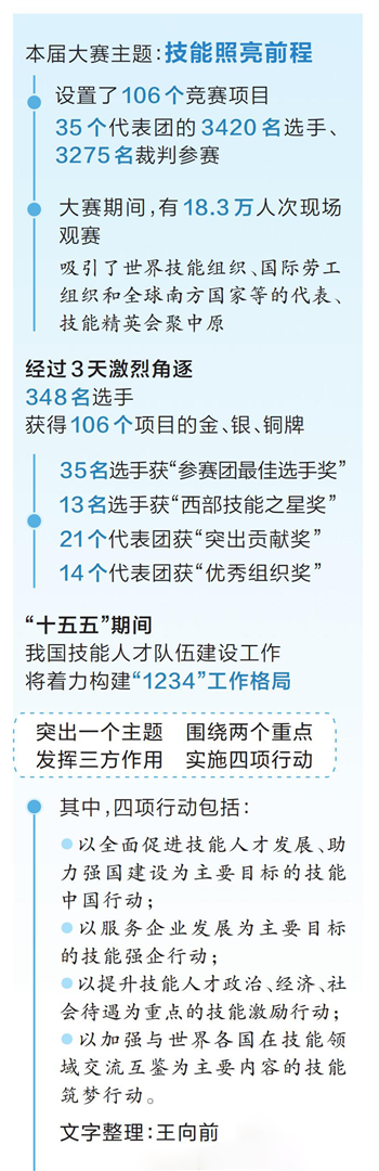 本届大赛以“技能照亮前程”为主题,设置了106个竞赛项目,35个代表团的3420名选手、3275名裁判参加大赛。本届大赛期间,现场观赛18.3万人次,并同期开展了技能强国论坛、技能展示交流和绝技绝活展演。“大赛进一步拓展了交流合作,实现开放共享、互学互鉴。”第三届全国技能大赛组委会委员、秘书处秘书长,人力资源社会保障部职业能力建设司司长吴礼舵说,在技能强国论坛上,邀请专家学者、高技能人才代表等分享前沿理论观点、交流特色实践做法、展示最新工作成果。全国400余家院校、培训机构拟共同发起“技能照亮前程”培训行动倡议,300余家职业技能评价组织共同发起高质量开展技能人才评价倡议,推动一批校企合作、区域协同项目落地。