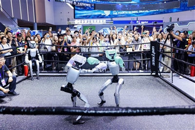 第四届全球数字贸易博览会在杭州开幕。 图为人形机器人现场“格斗”表演,吸引众多观展者驻足。