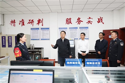洛阳市公安局孟津分局吉利派出所下辖4个社区、19个行政村,人口流动量大,规上企业较多。刘宁察看综合指挥室,亲切慰问坚守一线的基层民警。“习近平总书记在河南考察时指出,要盯牢风险隐患排查和治理,强化社会治安整体防控,有效防范化解重点领域风险,切实维护社会和谐稳定。”刘宁说,公安干警要践行“对党忠诚、服务人民、执法公正、纪律严明”总要求,坚持和发展新时代“枫桥经验”,以提高人民群众安全感和满意度为目标,完善立体化社会治安防控体系,加强社会面治安巡逻防控,提高见警率和接处警速度,依法惩治各类违法犯罪活动,提升维护公共安全能力水平。