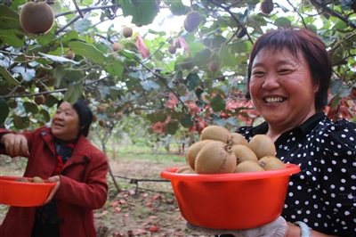 简村猕猴桃种植园中,村民手捧采摘下的猕猴桃露出笑脸。 王玉贵 摄
