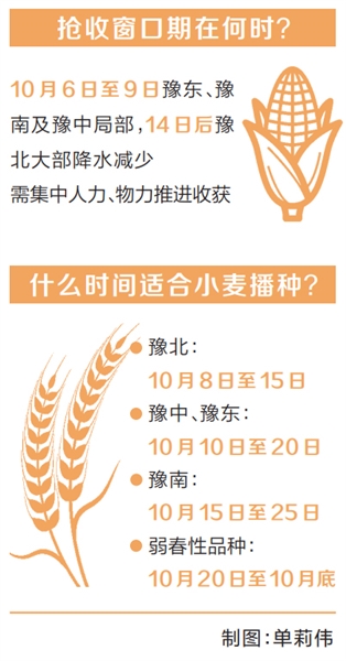 土壤偏湿地块的腾茬散墒同样紧迫。当前全省正推进已收获地块加快腾茬,对过湿地块采用开沟、翻耕等方式散墒降渍,为小麦适期播种创造条件。根据麦播技术指导意见,豫北适播期为10月8日至15日,豫中、豫东为10月10日至20日,豫南为10月15日至25日,弱春性品种为10月20日至10月底。