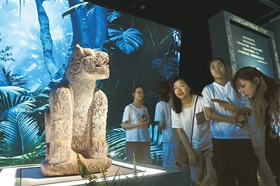 “雨林秘境——墨西哥玛雅文明大展”中的美洲豹形旗座。 本报记者 王铮 摄
