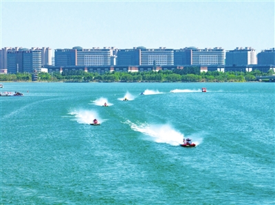 世界F1H2O摩托艇中国郑州大奖赛连续三年落户龙湖水域,图为赛手们正驾驶摩托艇你追我赶。