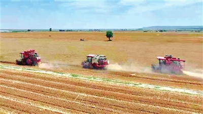 夏收时节,收割机在金色麦浪中奏响丰收的序曲。